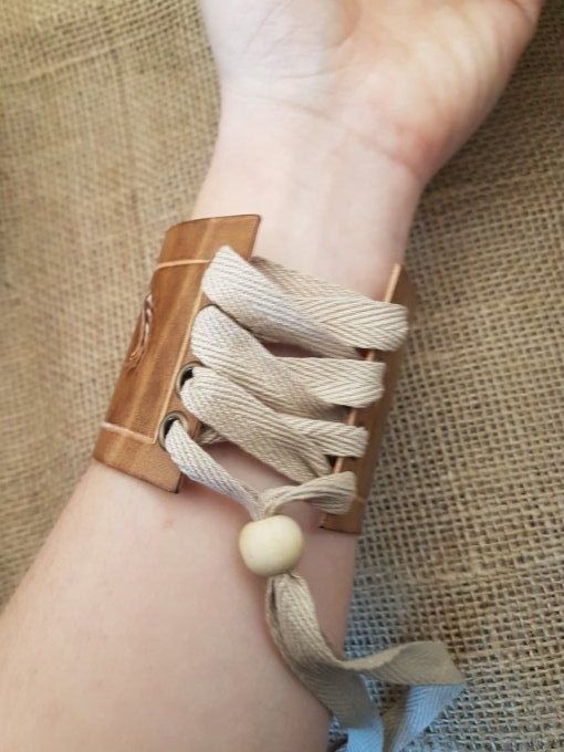 Le laçage est en coton tissé, pour assurer la solidité du bracelet, j'ai ajouté des oeillets en métal. Une perle de bois vient réunir les brins du bracelet, vous pourrez ajouter un noeud pour que la perle reste en place, lorsque vous l'aurez ajusté à votre bras.