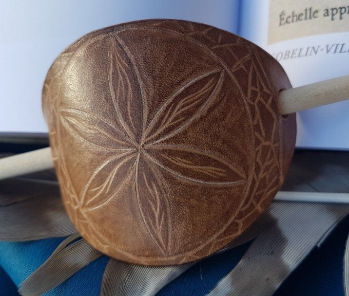 Barrette ovale rosace en cuir revalorisé. Repoussée à la main. Dimensions : 7 x 5,5 cm