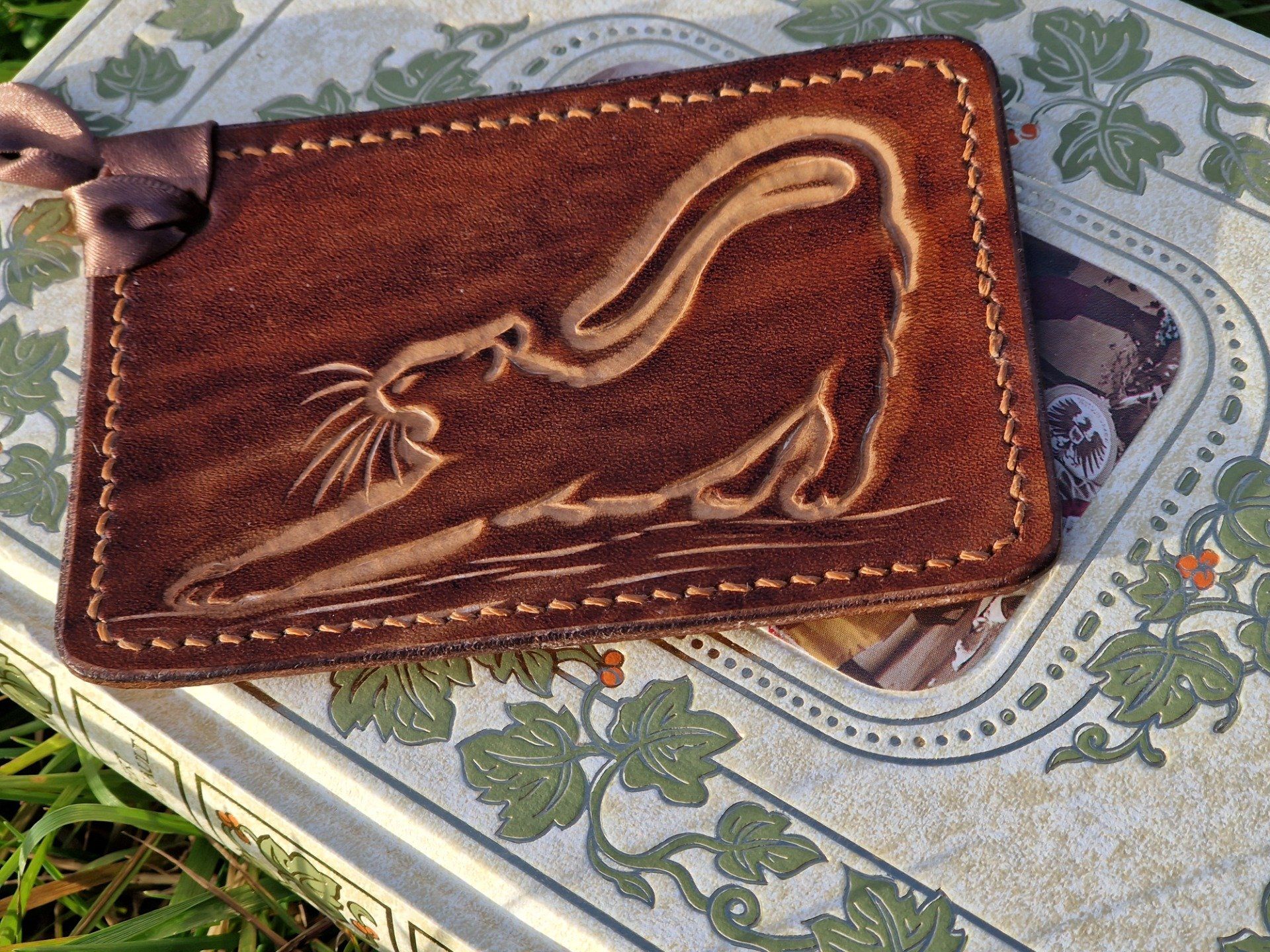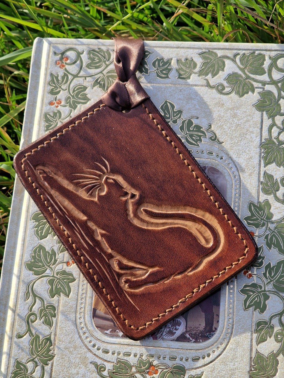 Marque-pages chat en cuir de tannage végétal repoussé et cousu main.