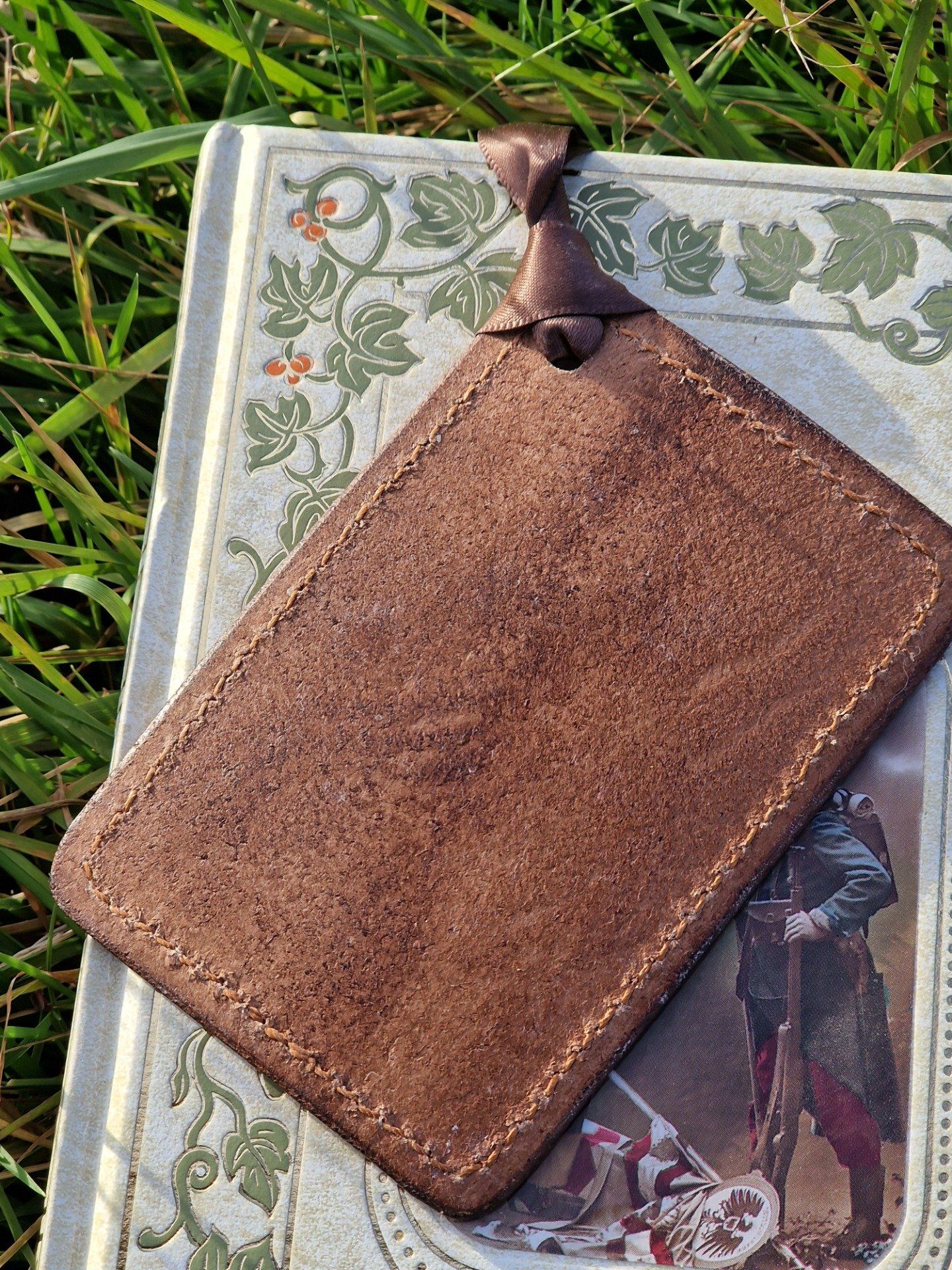 J'ai réalisé l'ensemble à la main sur du cuir de tannage végétal, la couture en point sellier est réalisée avec un fil de lin poissé. Le marque-pages a été ciré.