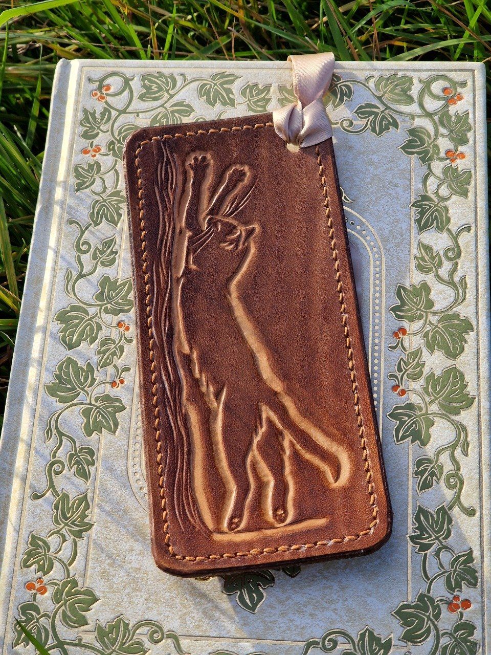 Marque-pages chat en cuir de tannage végétal repoussé et cousu main.
