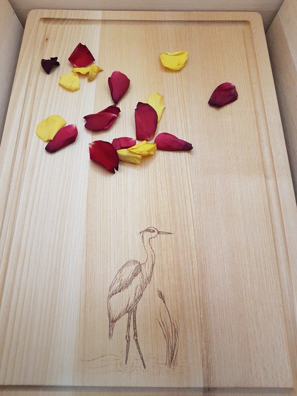 Le héron est un des oiseaux que j'affectionne, il est particulièrement majestueux. C'est pourquoi j'ai choisi de le représenter dans un marais, sur cette planche de service en bois de hêtre, traitée à l'huile de lin.