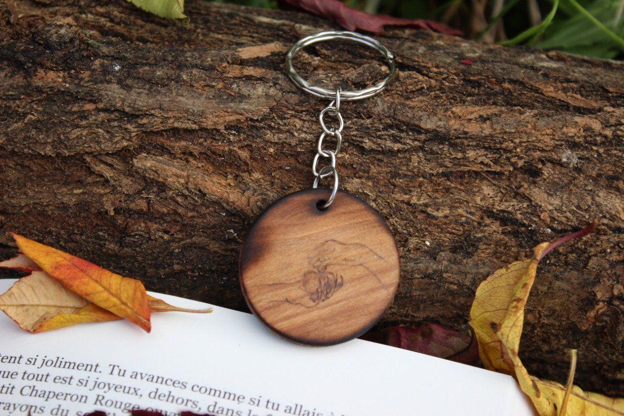 Porte-clefs en bois de peuplier stabilisé, sur le thème du conte "Blanche Neige" des frères Grimm.