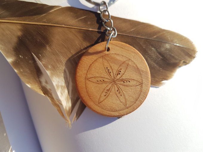 Ce porte-clefs en bois de peuplier, entièrement fait à la main dans mon atelier, représente une rosace simple, qui s'ouvre telle une fleur, dans un cercle.